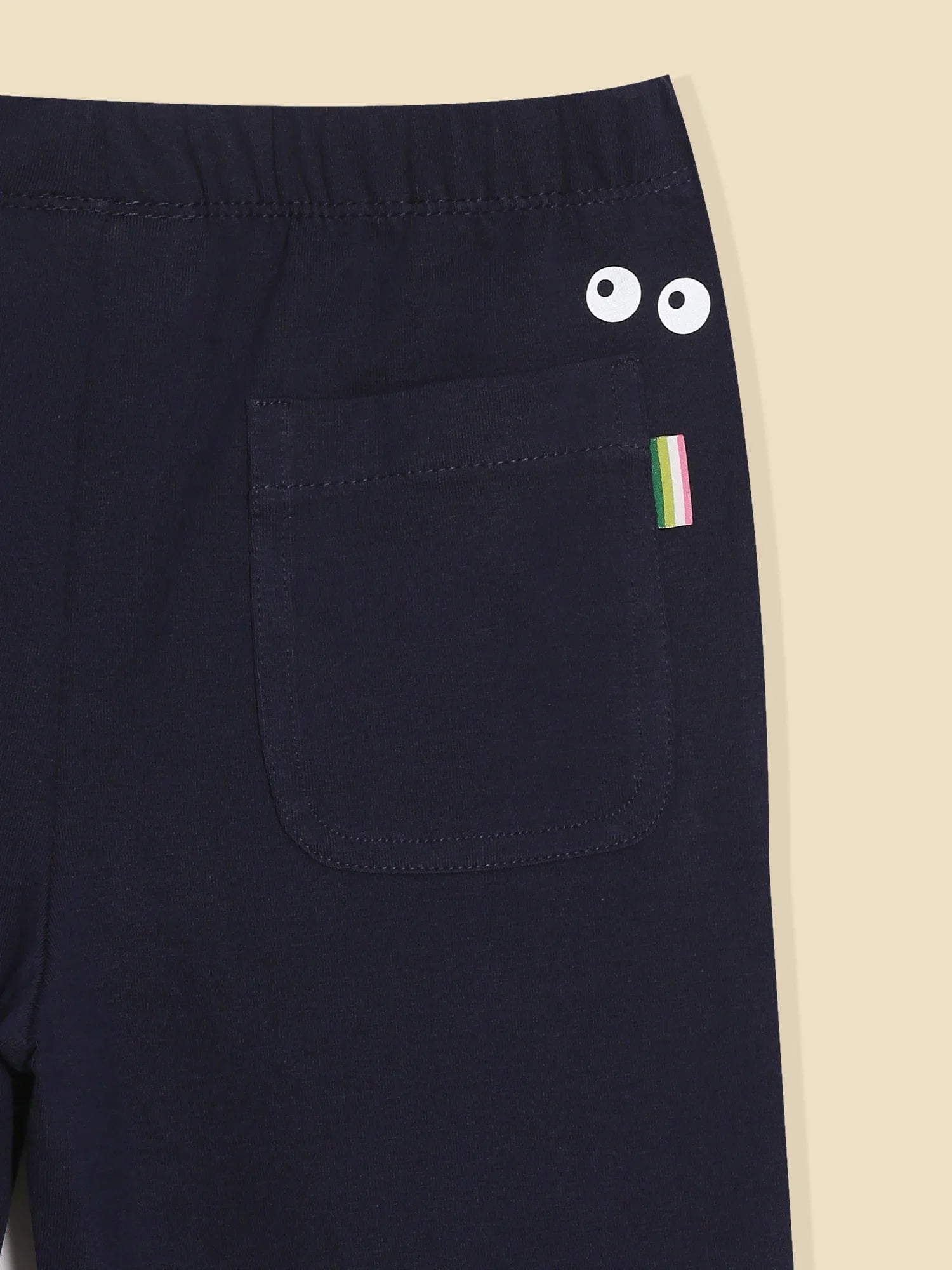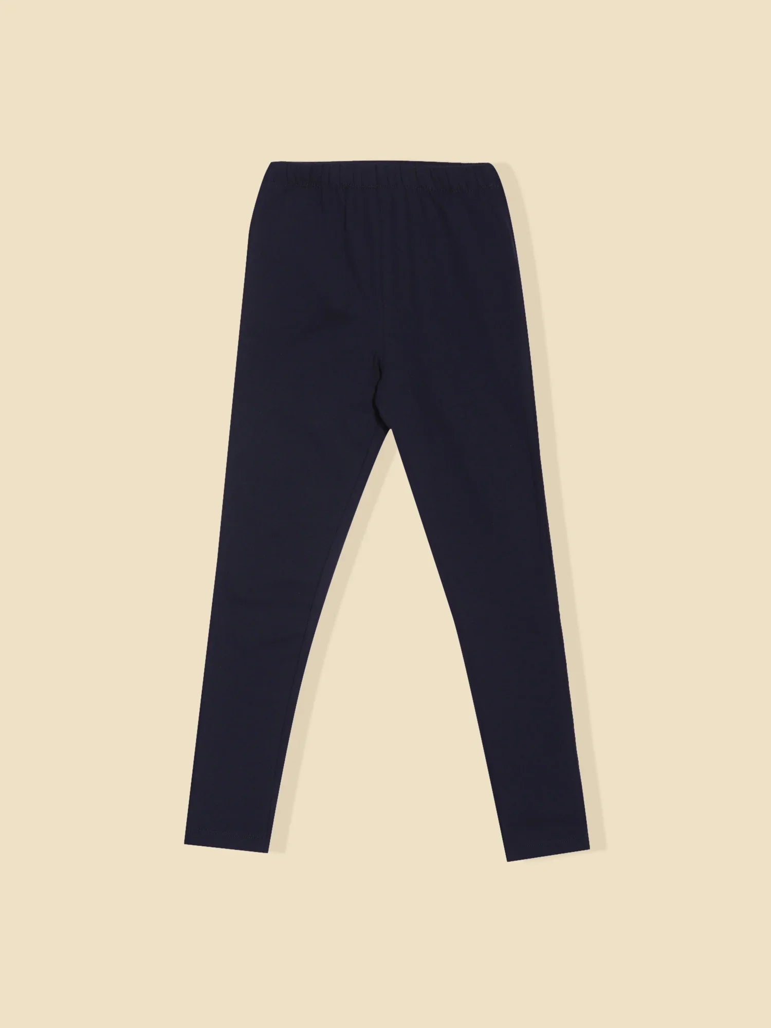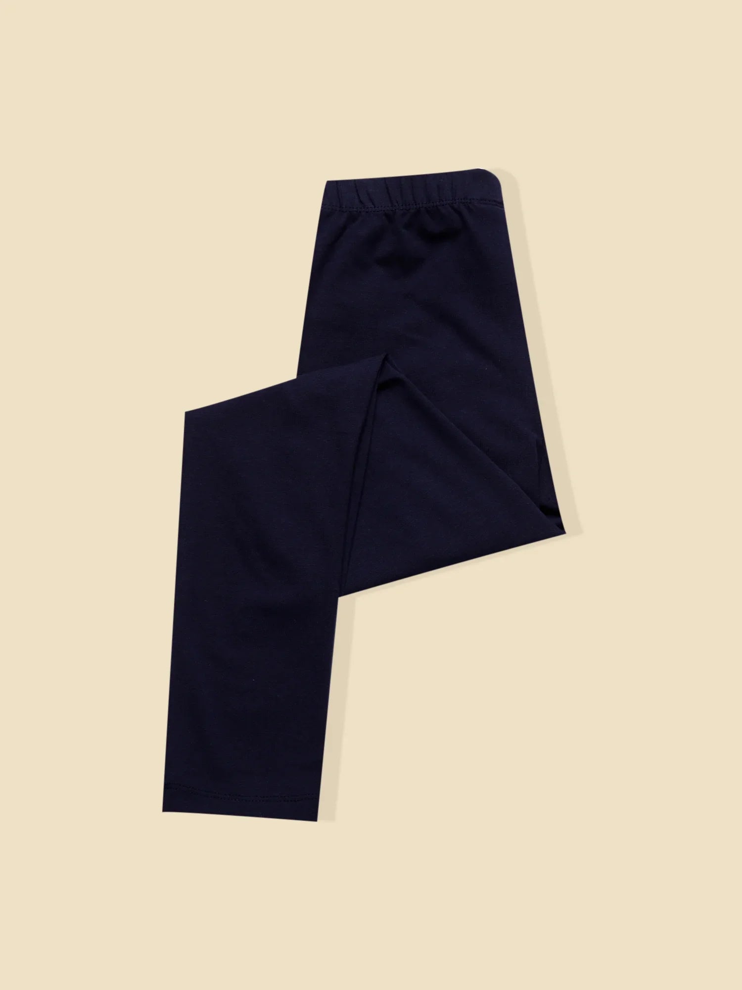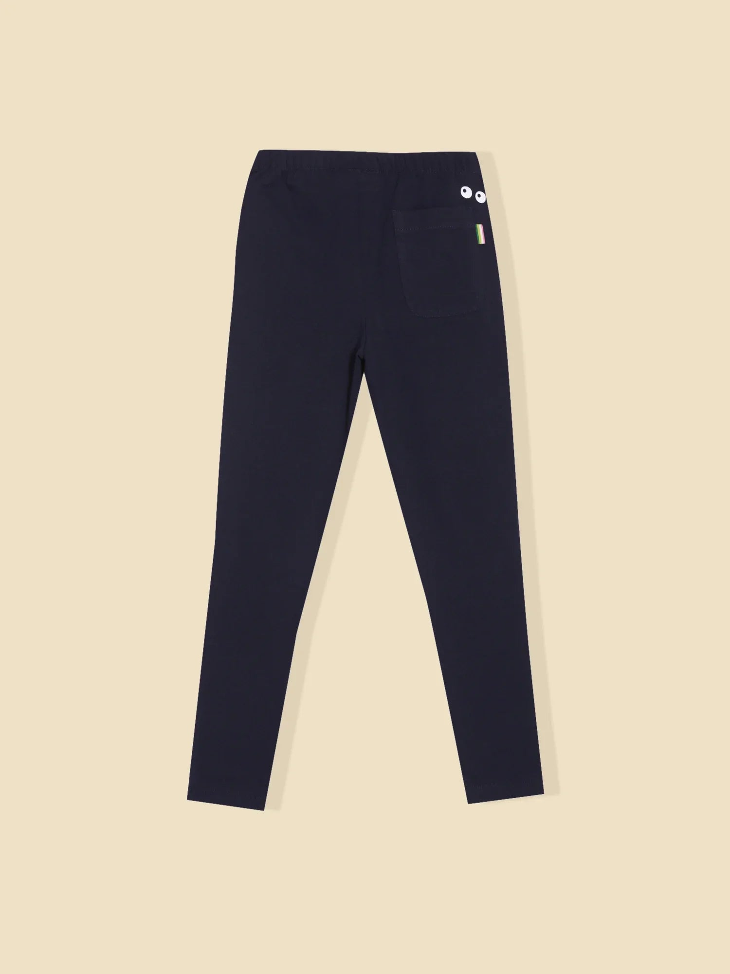 Sculpt with clay or read a favourite storybook in the Trendy Navy Leggings. The leggings are stretchy,soft and breathable offering all-day comfort and a snug fit that moves with your child. with playful designs, beautifl embroidery and a functional back pocket, these leggings are trendy and functional for kids from 2 to 10. Fit: Regular Fabric: 95% cotton, 5% elastane, Single Jersey Care Instruction: Tumble dry with cold water; keep it fresh, do not bleach. Color: Navy Blue