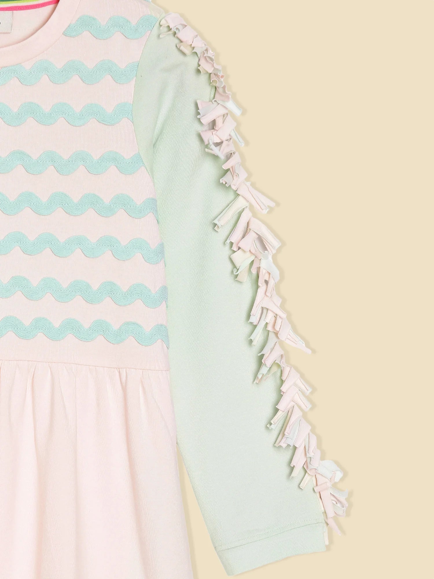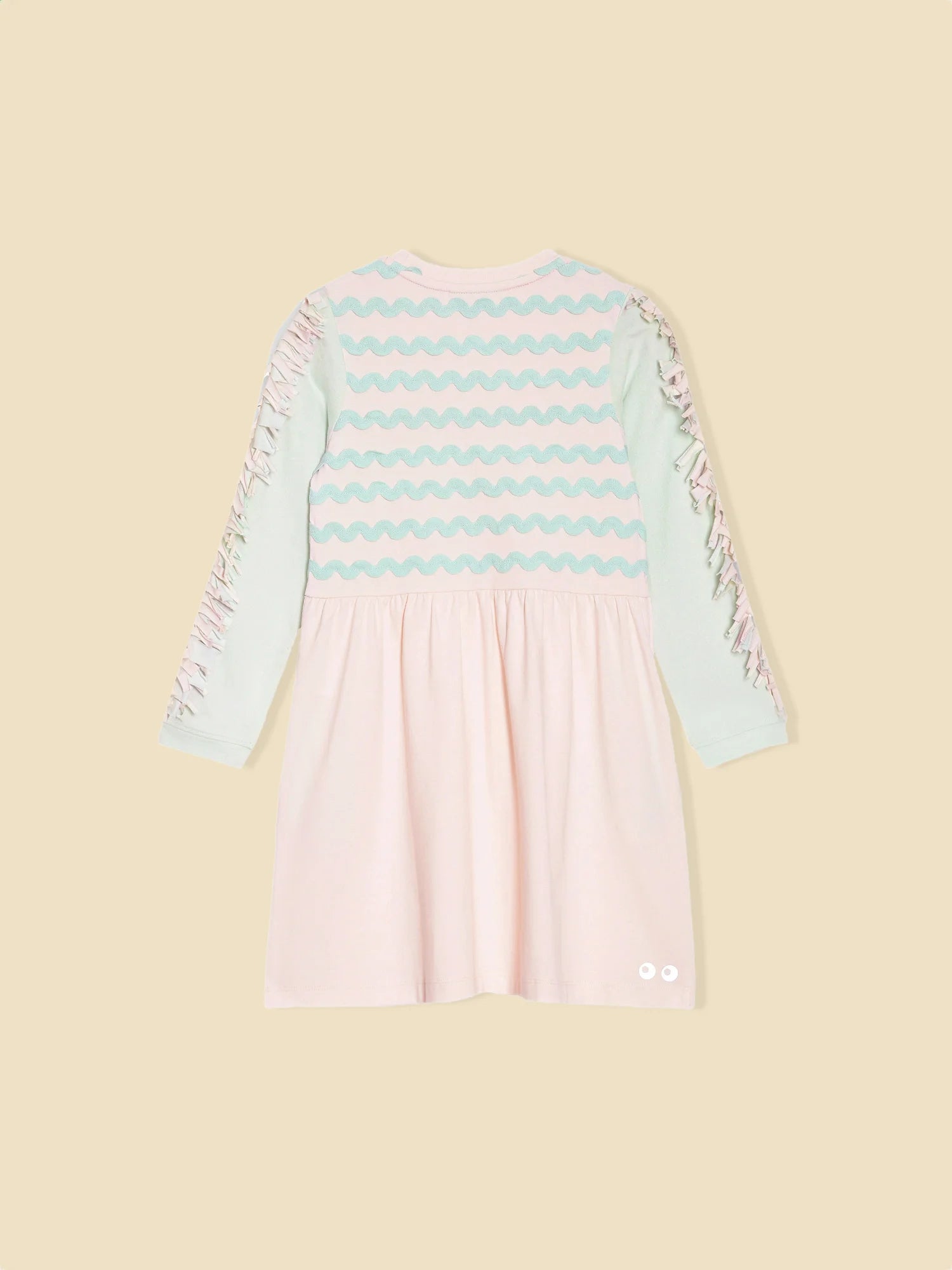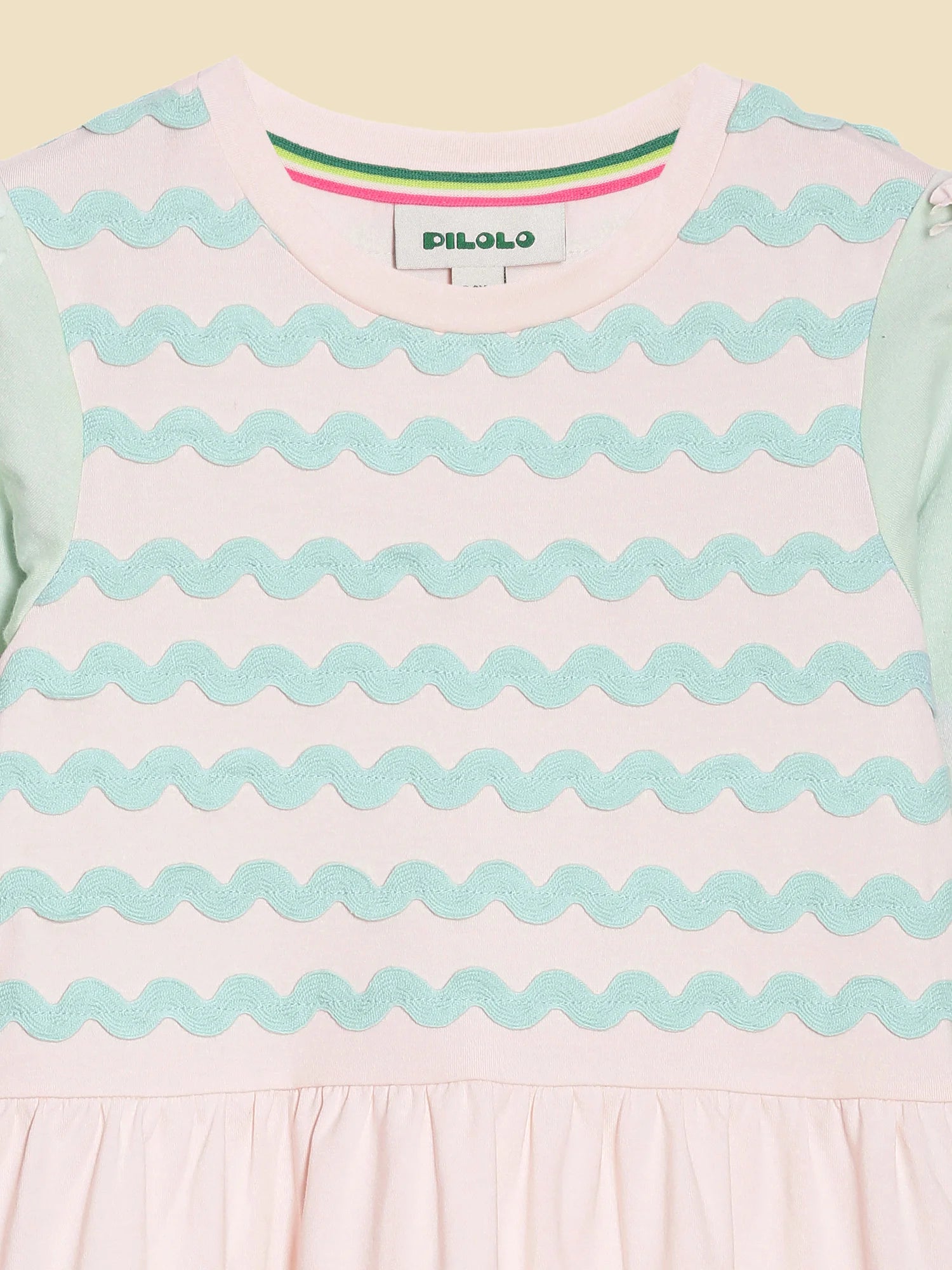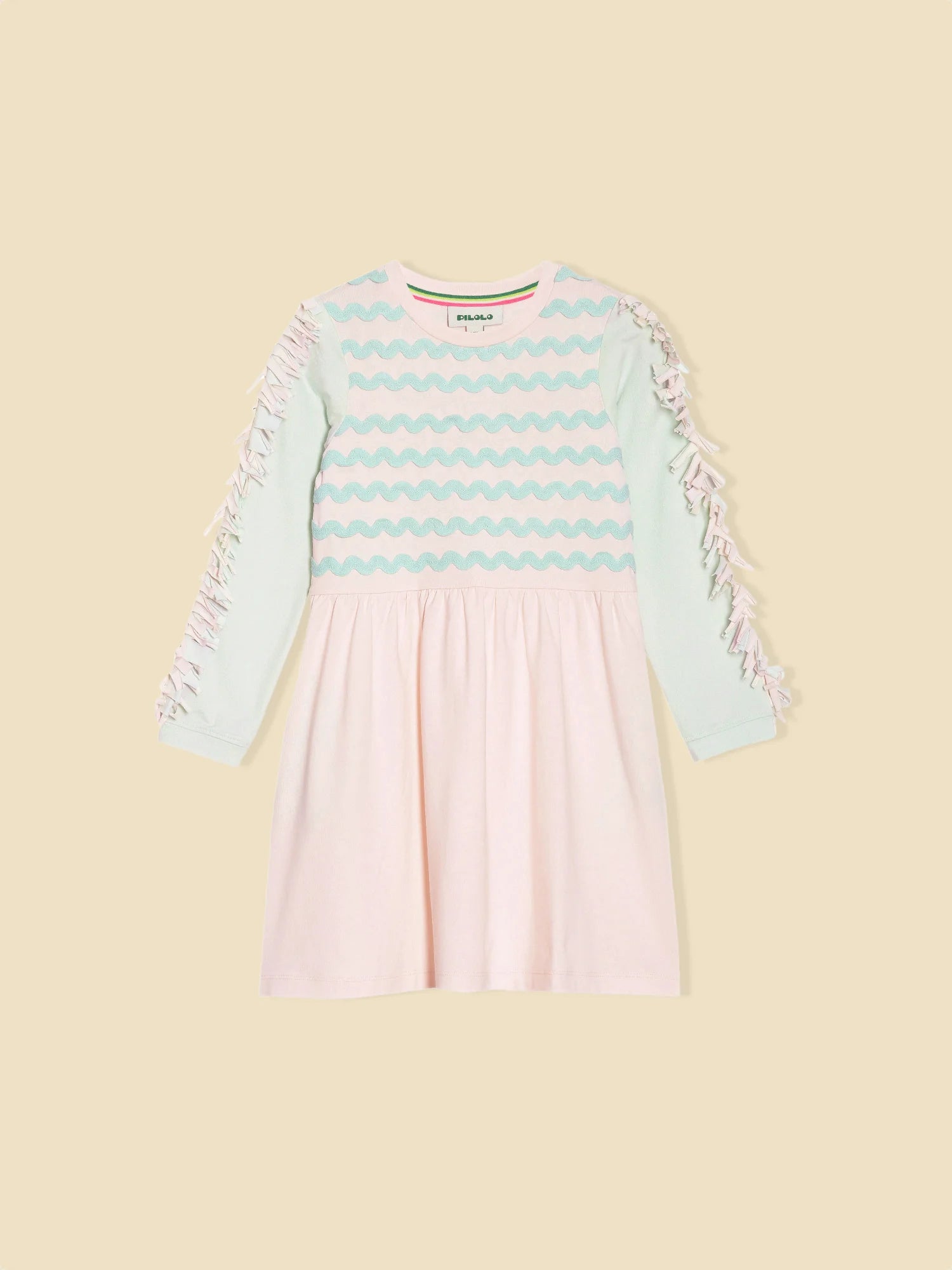 This Pilolo Kids Wear Dress is decorated with beautiful lace and has adorable fringed sleeves that add a playful touch.