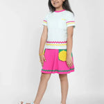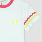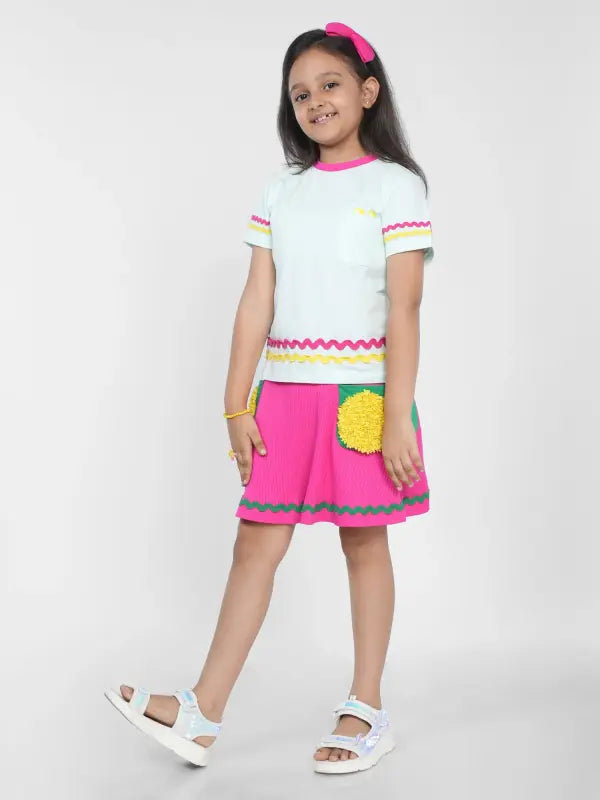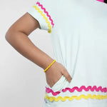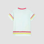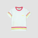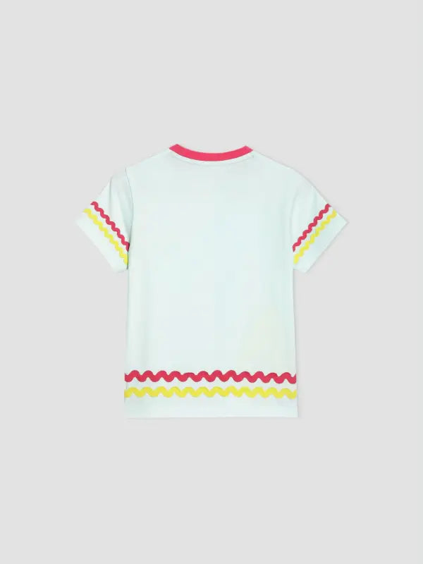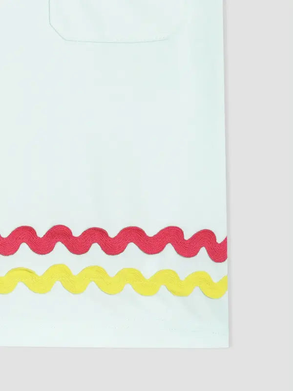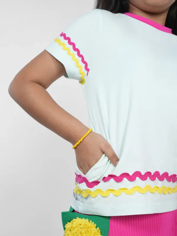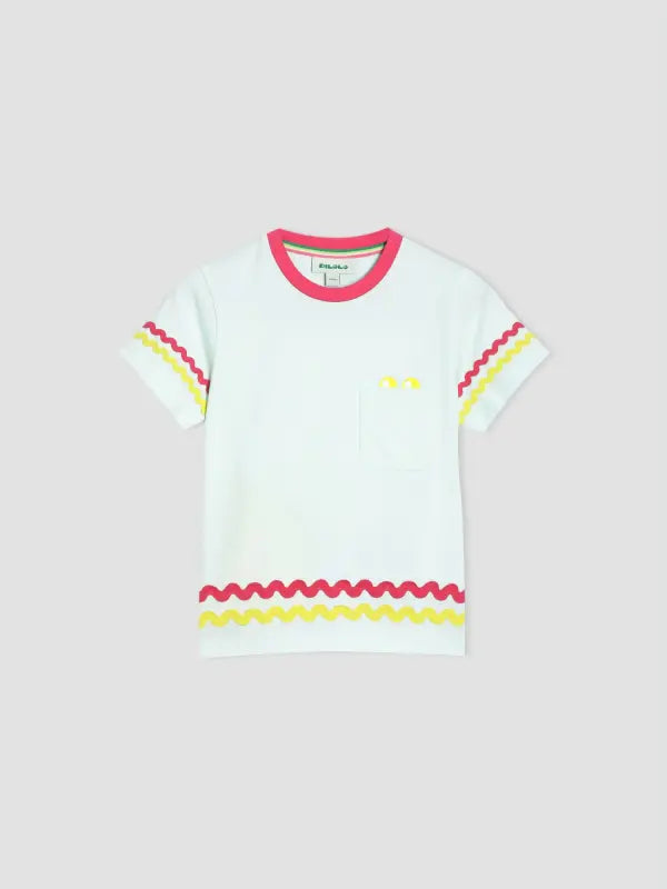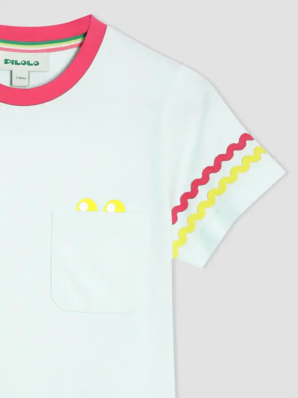 This Pilolo Kids Wear T-shirt is a vibrant burst of colours. The t-shirt is trimmed with colourful ric-rac. Our Logo plays peek a boo with the pocket, peeping to look out at a world of endless possibilities.
