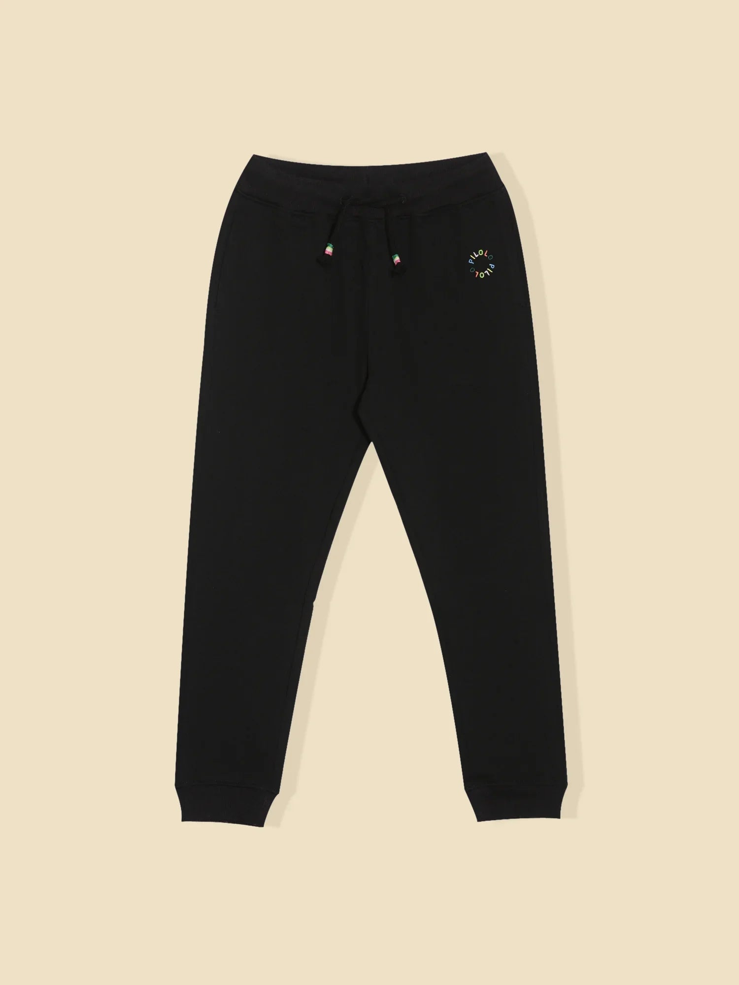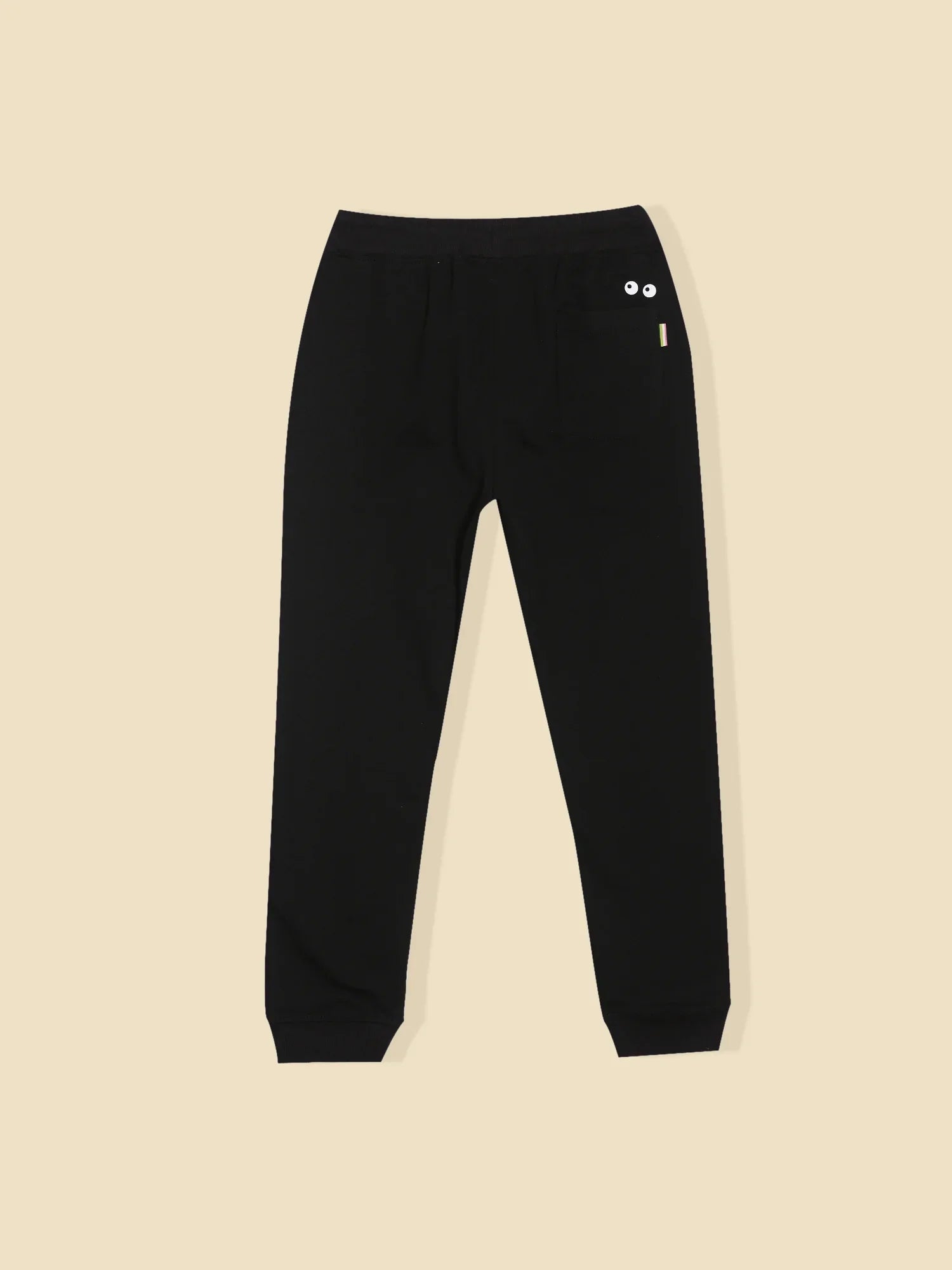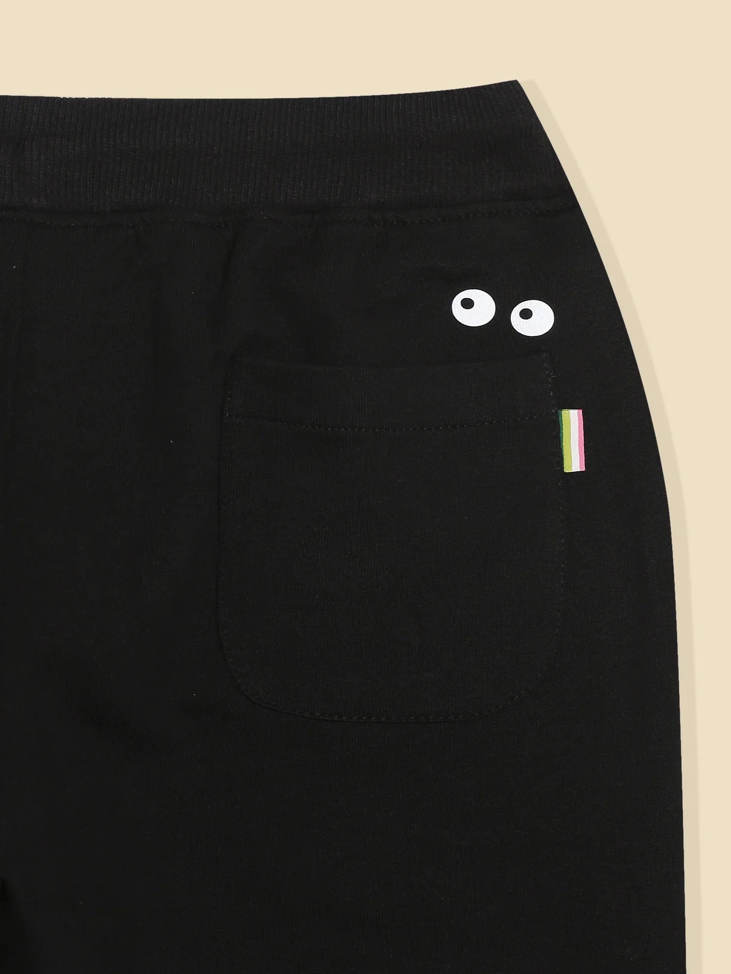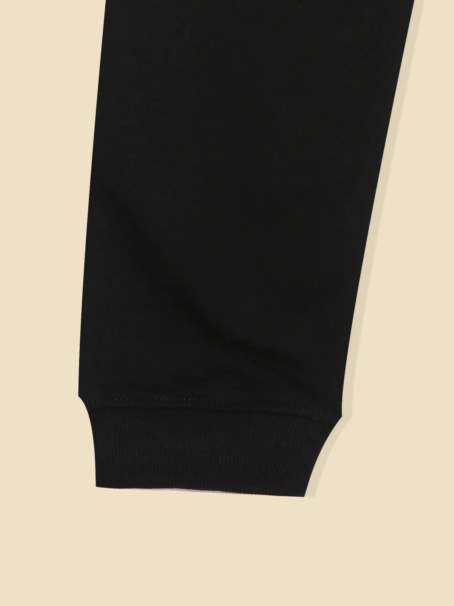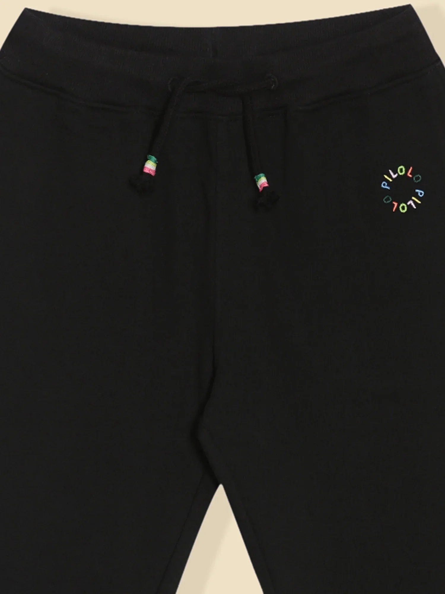 Explore new places and celebrate big wins in the Active Black Joggers. The joggers have aesthetic and practical uses as it features embroidery, pockets, an elastic waist, and drawstrings offering your child a firm fit. Fits kids from 2 to 10. Whether its a stroll on a breezy evening or an impromptu dance party, these joggers are built for every whim and fancy. Fit: Regular Fabric: 95% cotton, 5% elastane, French Terry Lycra Care Instruction: Tumble dry with cold water; keep it fresh, do not bleach. Waist: Mid-Rise Color: Black