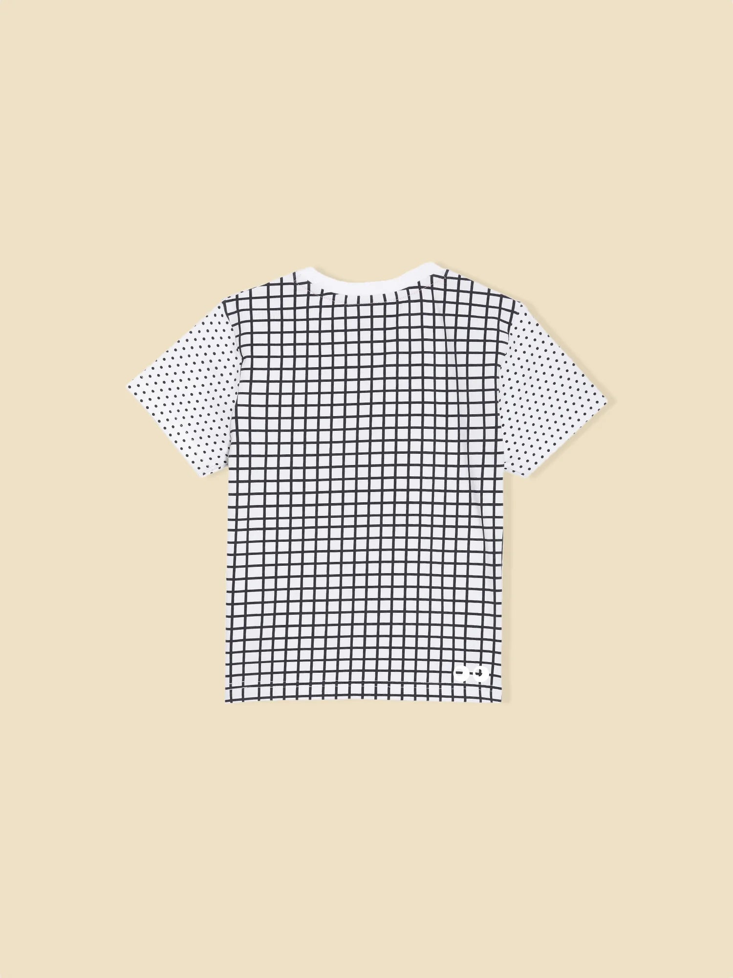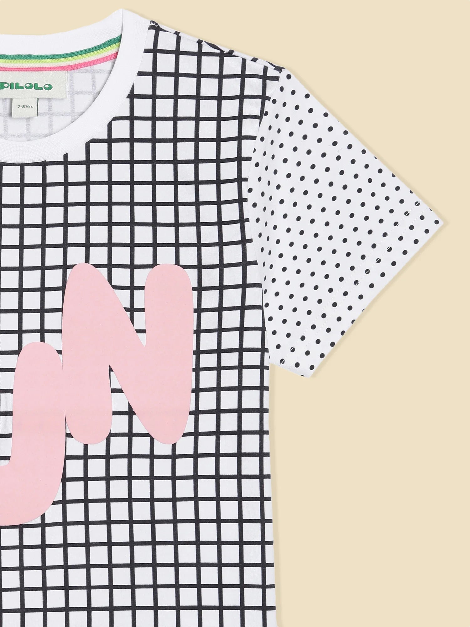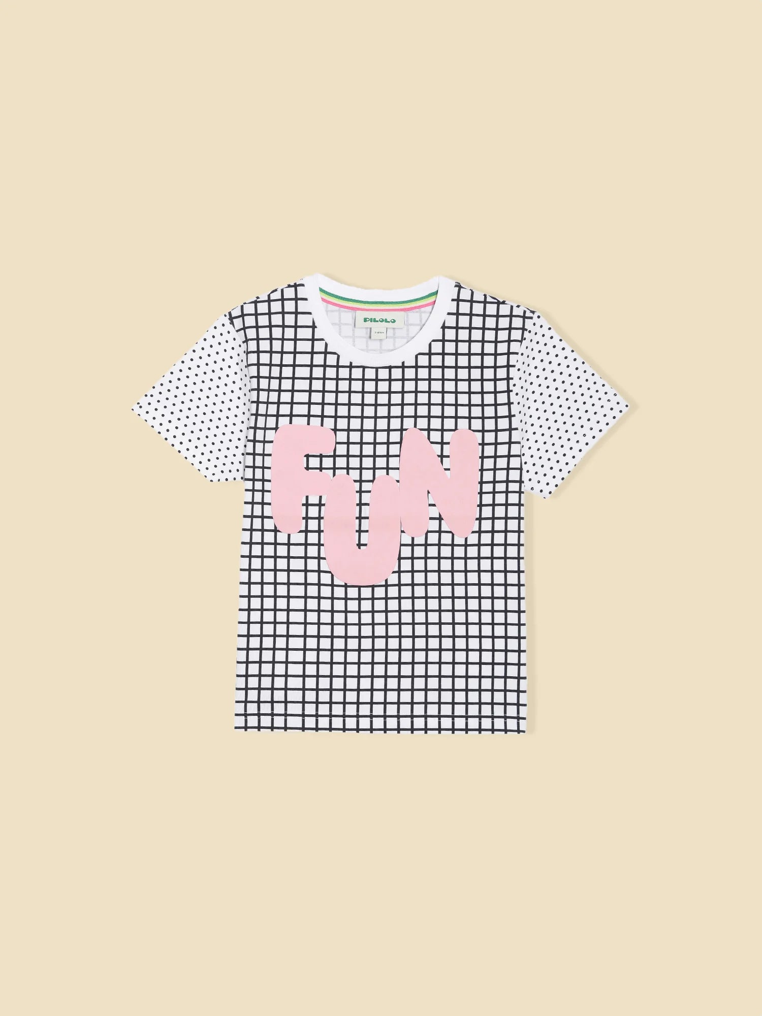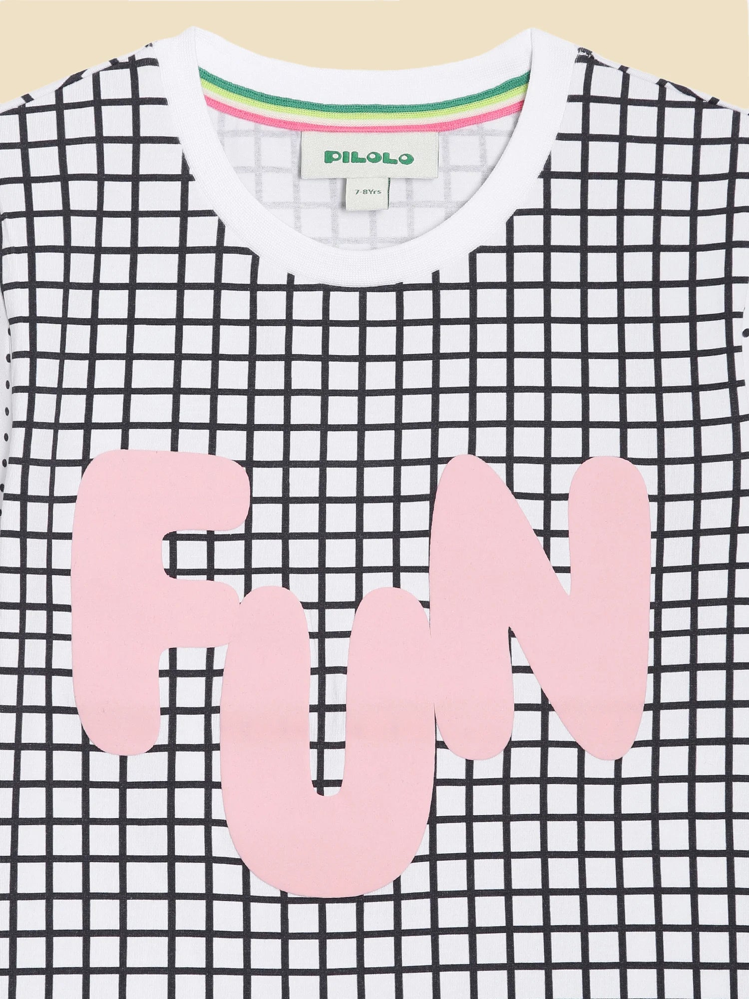 This Pilolo Kids Wear T-shirt is designed with a classic checkered pattern and has bold capital letters that spell out "FUN."