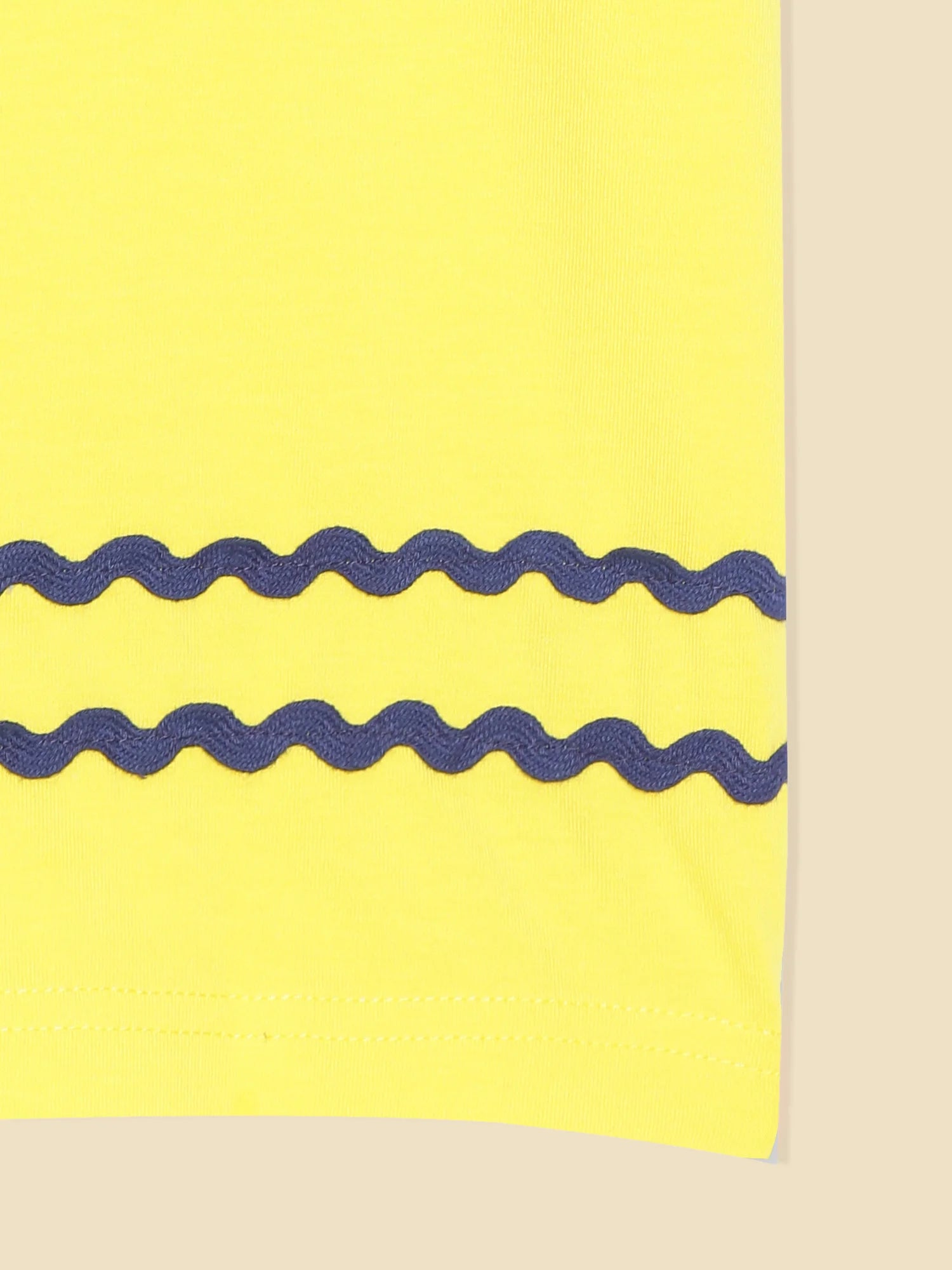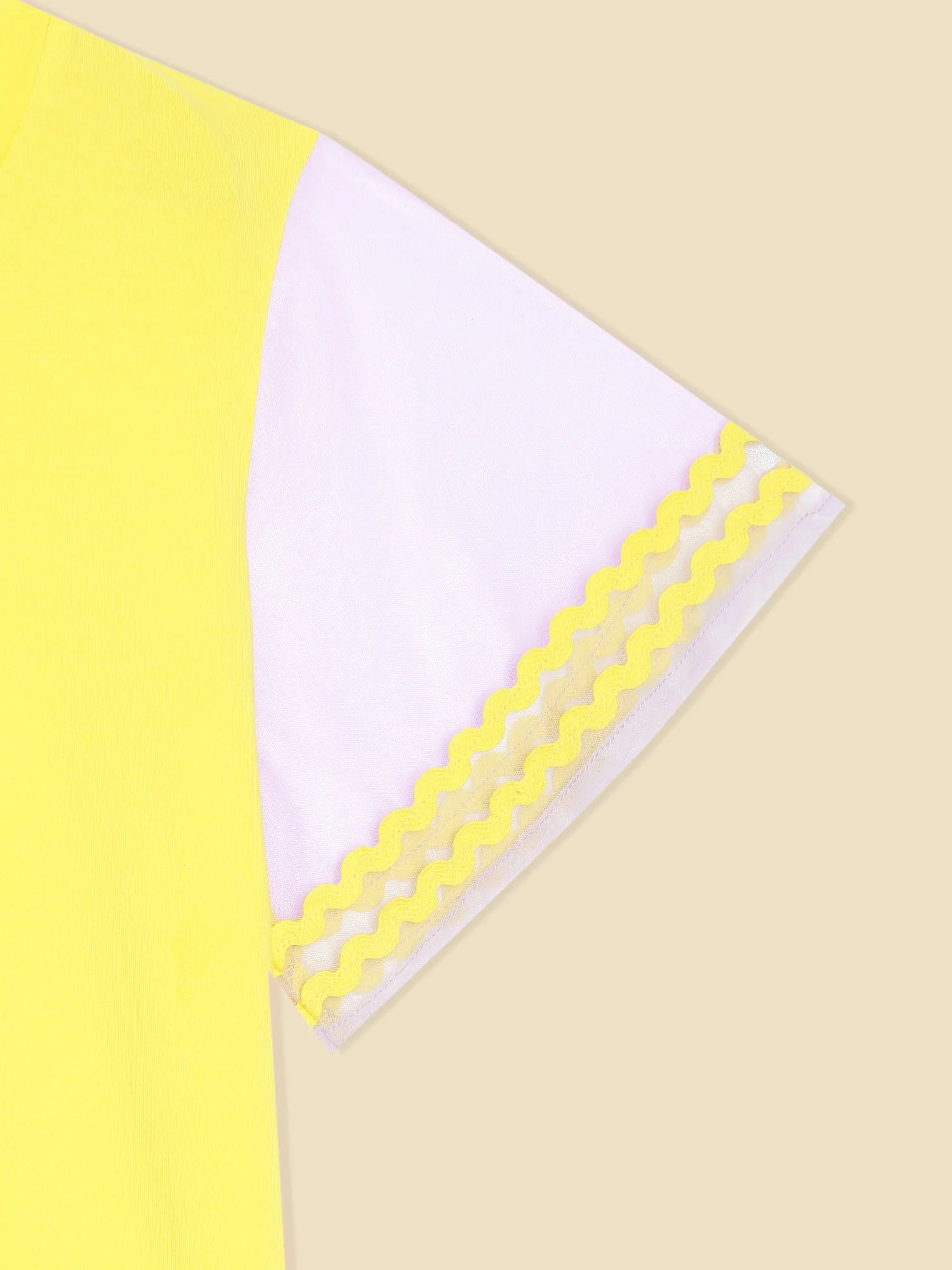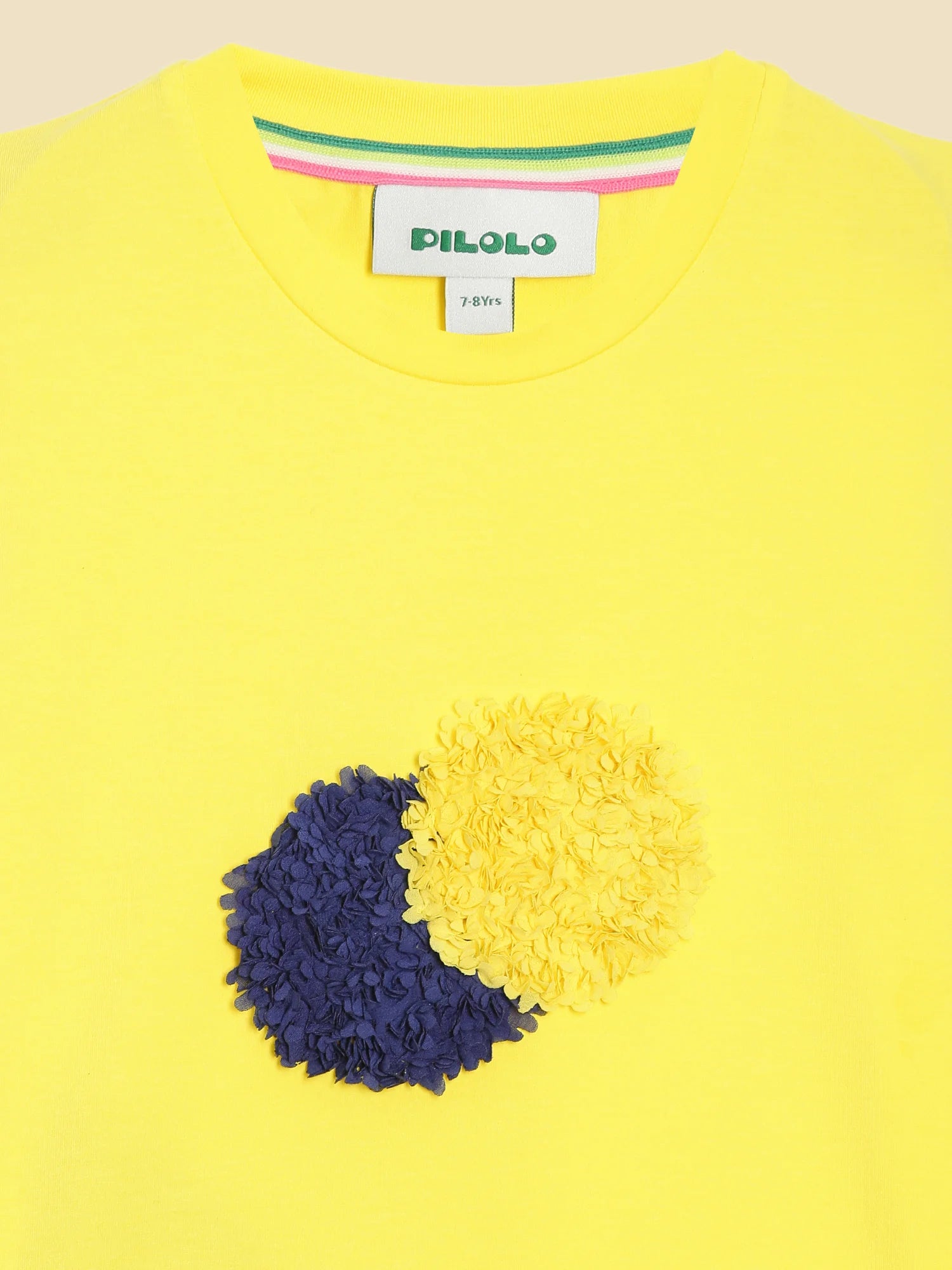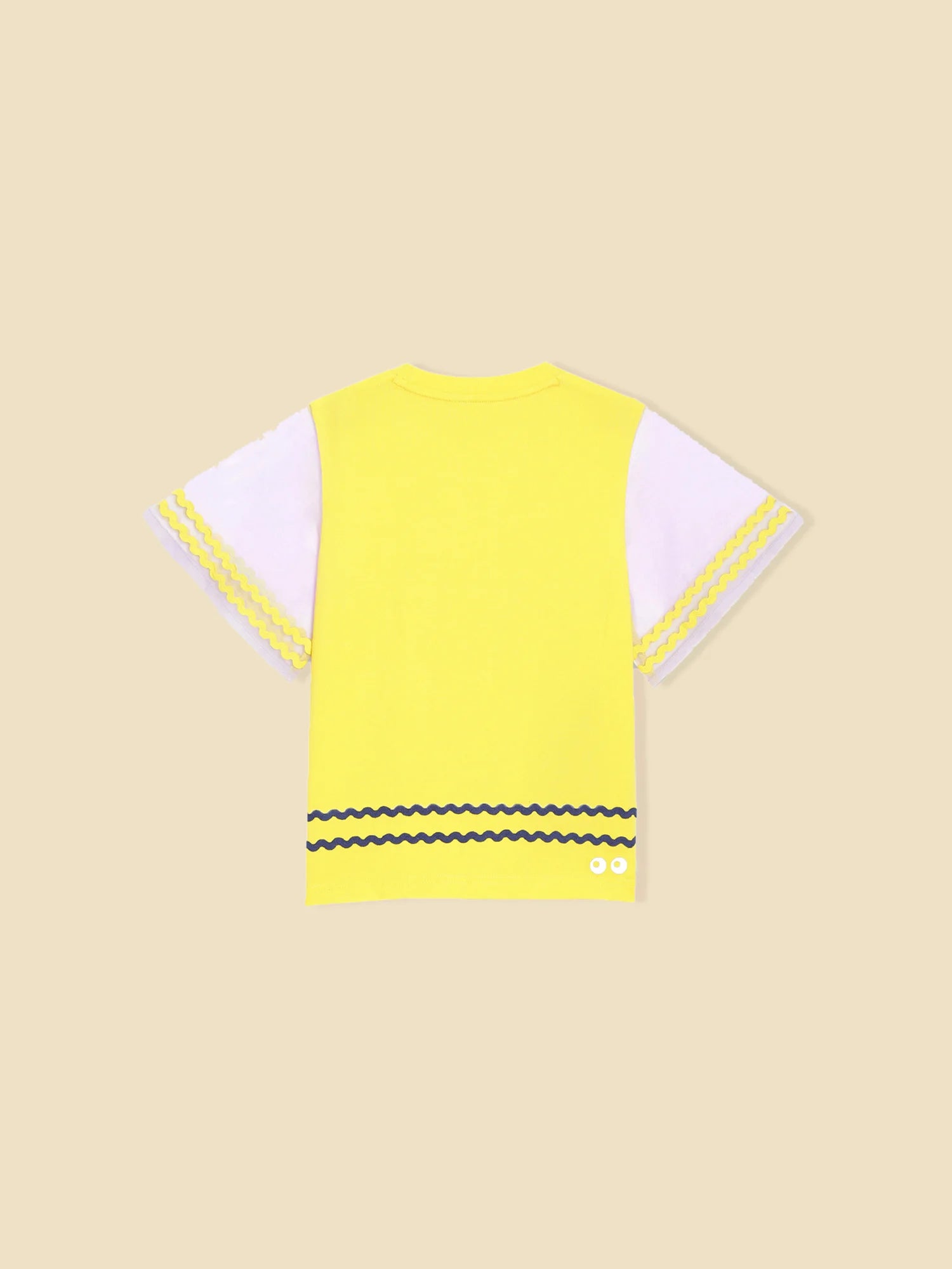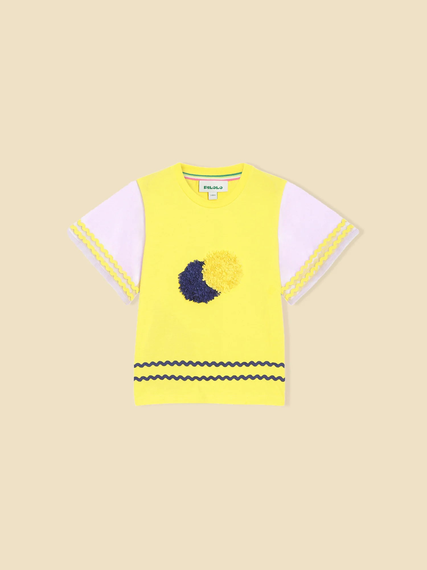 This Pilolo Kids Wear T-shirt has exaggerated pompoms and ric-rac embroidered oversized polka dots, with tulle sleeves and a ric-rac border.