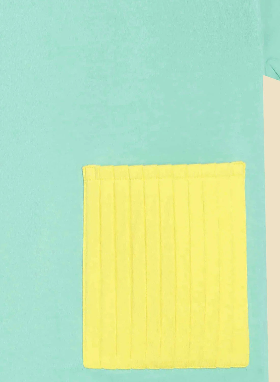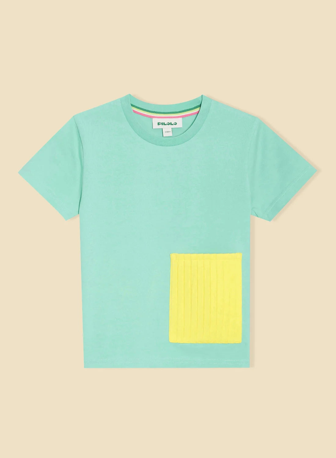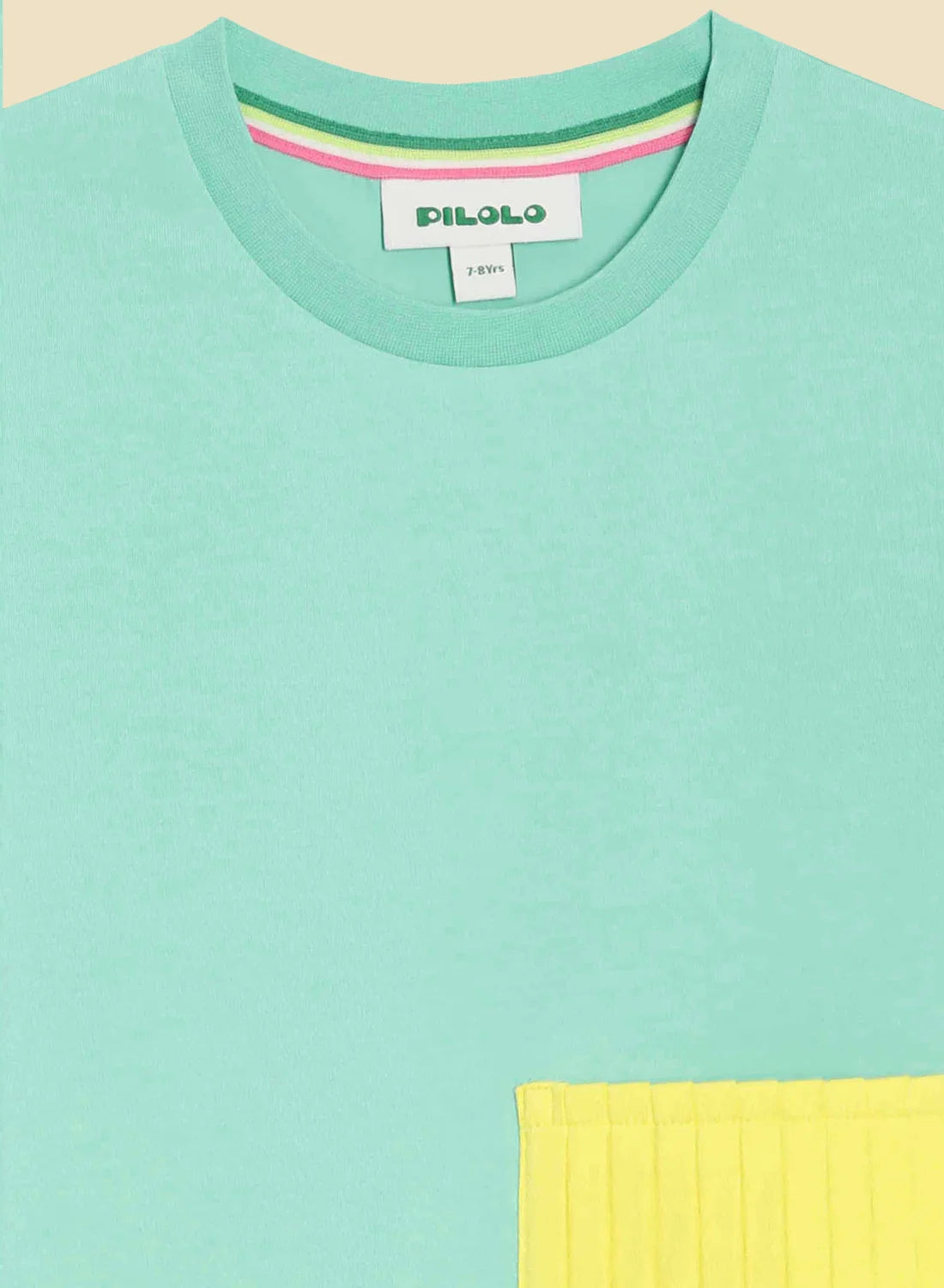 This Pilolo Kids Wear T-shirt is made fun and playful with an eye-catching yellow pleated, origami-inspired pocket.