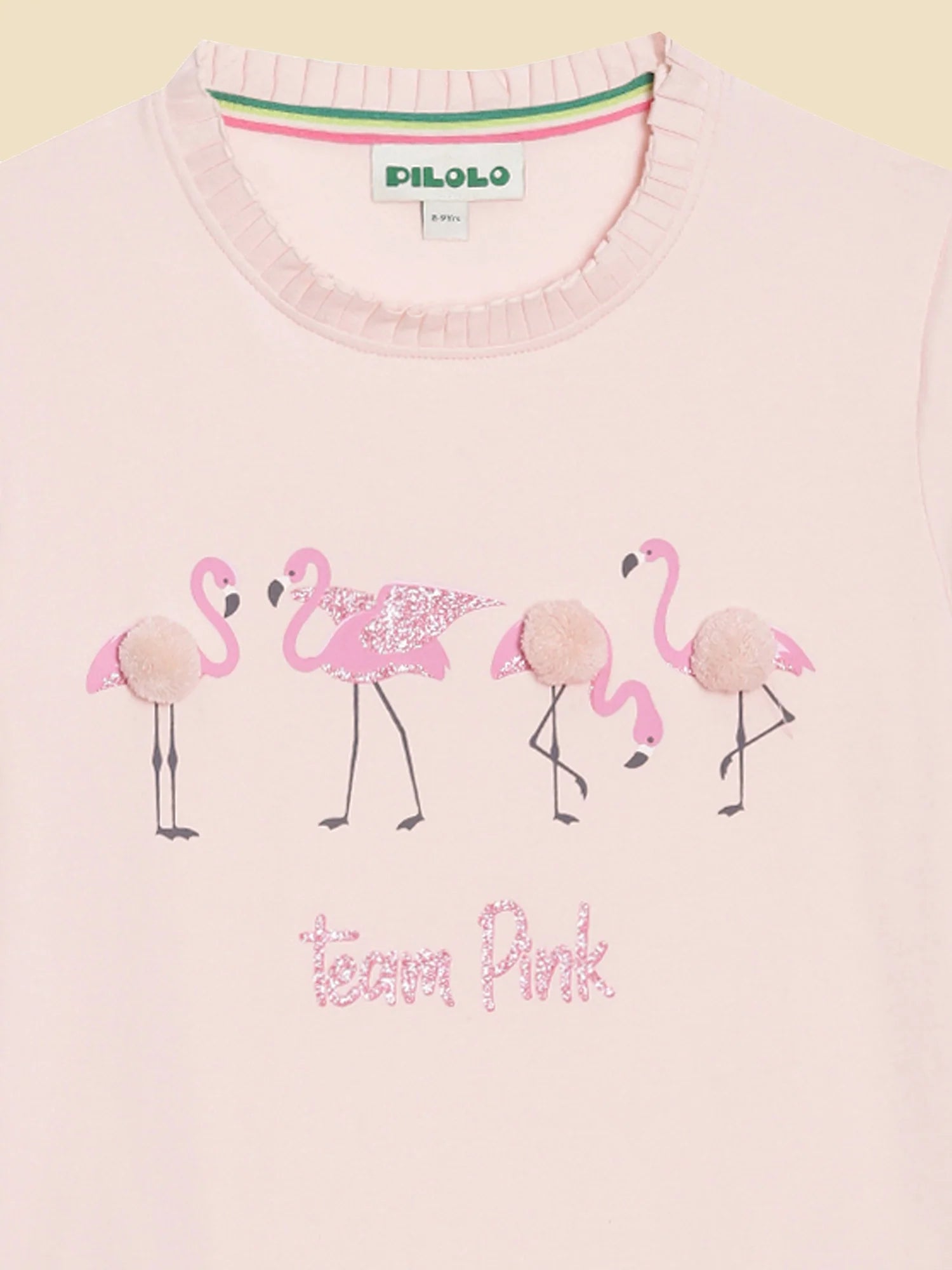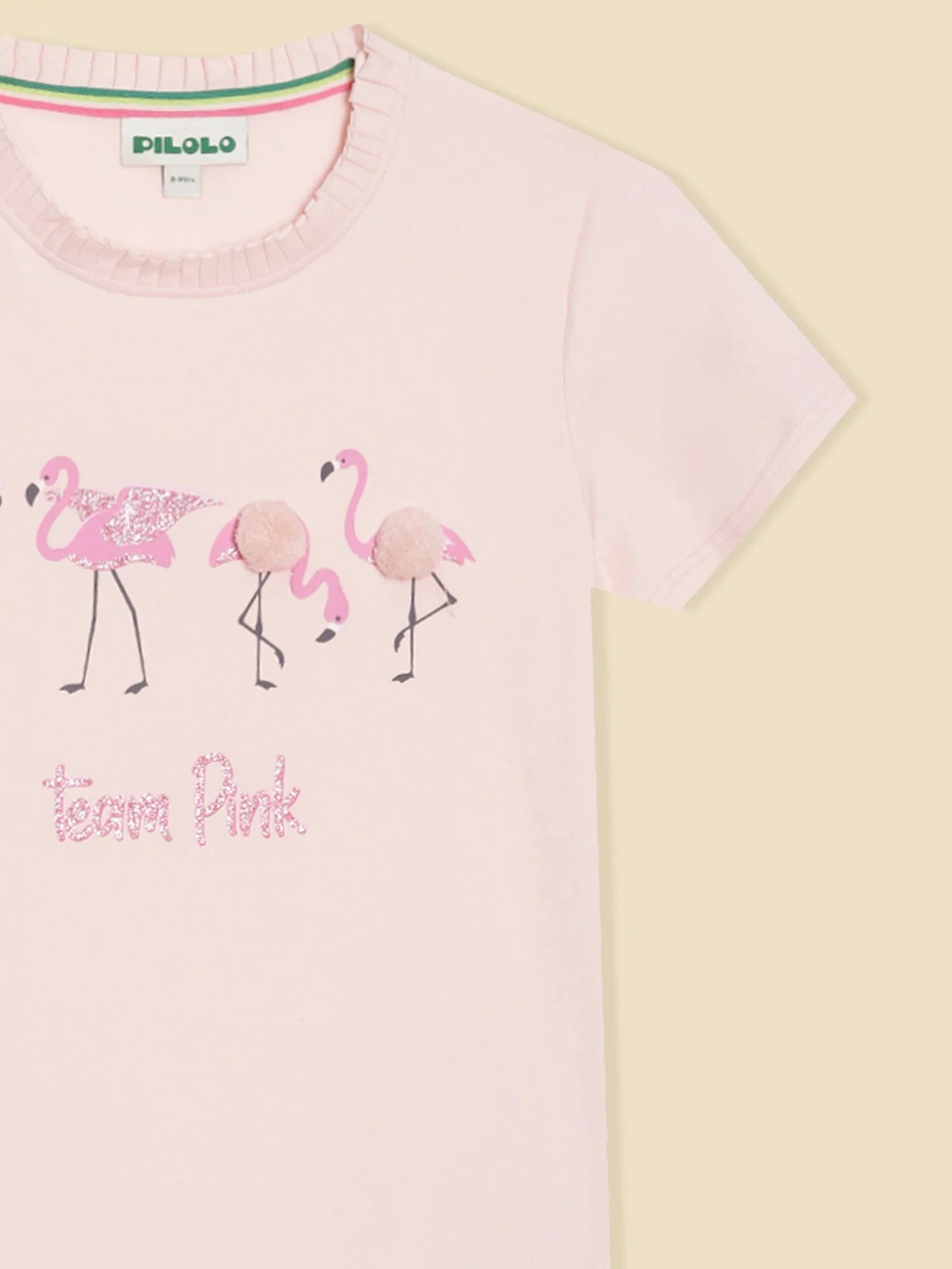 Made with soft, breathable materials, the Flamingo Squad Tee lends comfort to every adventure. It features a fun, colorful design with puff sleeves, glitter prints and pom pom flamingoes. Every piece comes with a pocket that is adorable and practical - as little hands deserve a place to tuck their little adventures. Made to fit kids 2 to 10.