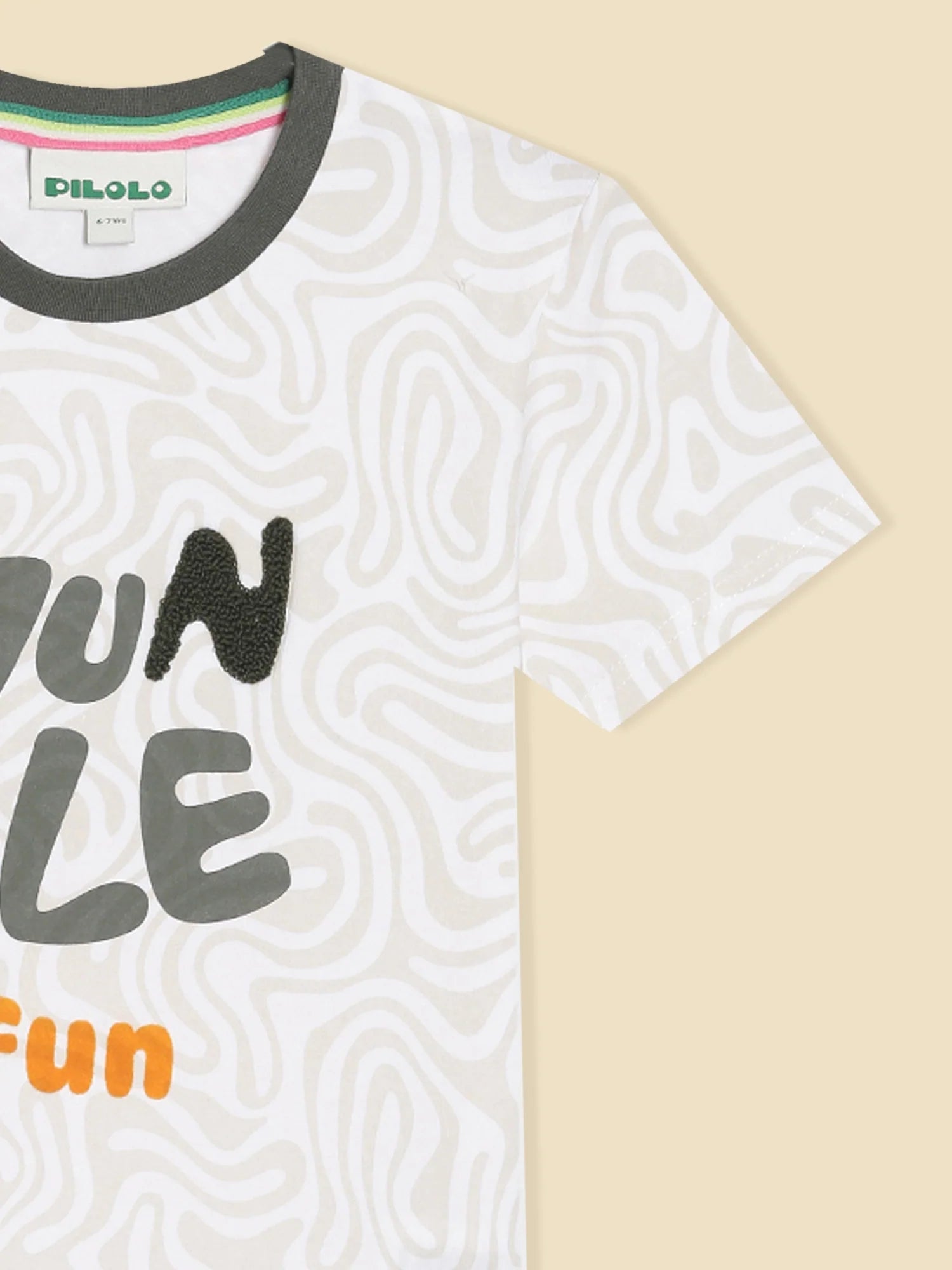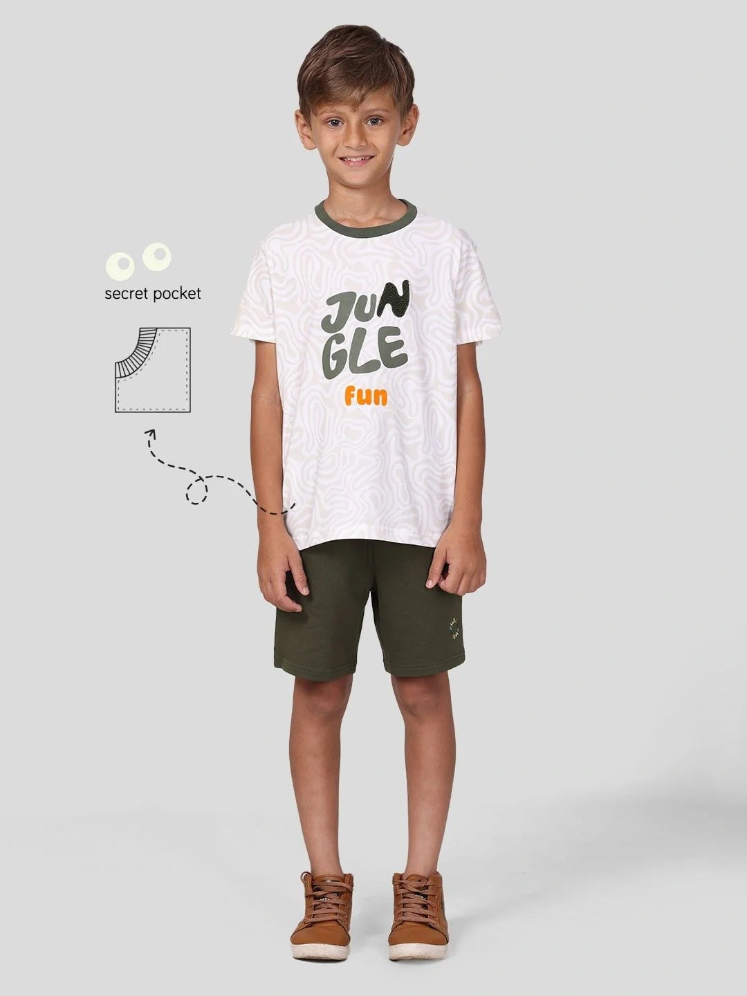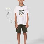 Whether climbing trees or looking for treasures, the Jungle Explorer Tee blends comfort with adventure thanks to its soft, breathable fabric. It features text with chennile embroidery on an intriguing background and a contrasting neckband. Every piece has a pocket that is adorable and practical - as little hands deserve a place to tuck their little adventures. Made to fit kids 2 to 10.